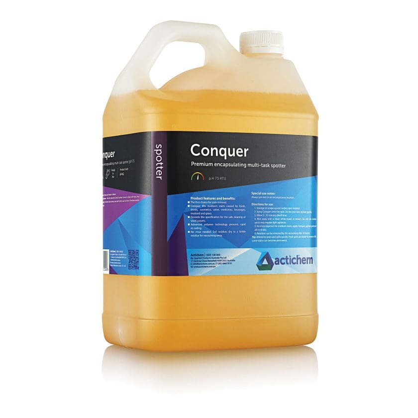 The unbeatable multi-task spotting solution effective on a wide range of water based and oily stains, with the added benefit of anti-resoiling encapsulation technology. The Conquer formulation provides serious stain removal properties for a wide scope of stain types but has a unique focus on fibre care and anti-resoiling functionality.