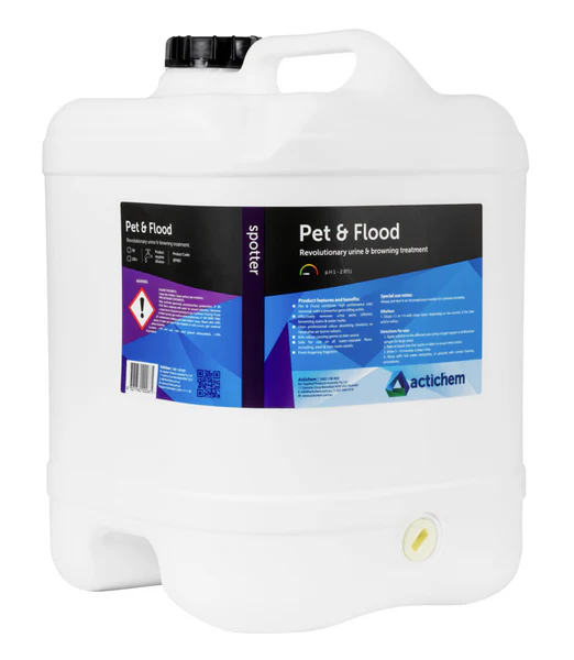 Pet & Flood is a unique spotting solution for high performance removal of cellulosic browning, urine stains and the associated odours. This innovative formulation combines a powerful urine crystal & stain removal blend with a 2-pronged microbiocidal chemistry specific to Urine decontamination and odour neutralization.
